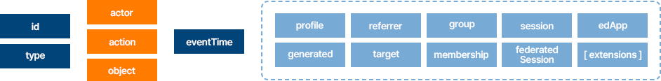 아래 그림에 점선으로 표시된 부분은 이벤트를 보다 정밀하게 기록할 수 있도록 이벤트를 발생시킨 사람의 소속, 이벤트가 발생한 구체적인 학습 환경이나 도구, 이벤트를 발생시킨 목적 등 맥락을 상세하게 기록할 수 있는 속성들도 정의하고 있음