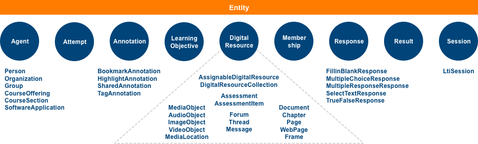 Caliper Analytics 표준에는 이벤트 유형과 구문 규칙 외에도 학습 활동과 관련된 구체적인 개체(entity)의 유형도 정의하고 있는데, 구문 규칙상 주어와 목적어, 부가적인 맥락을 설명하는데 사용되는 정보들이 각각의 개체로 표현됨