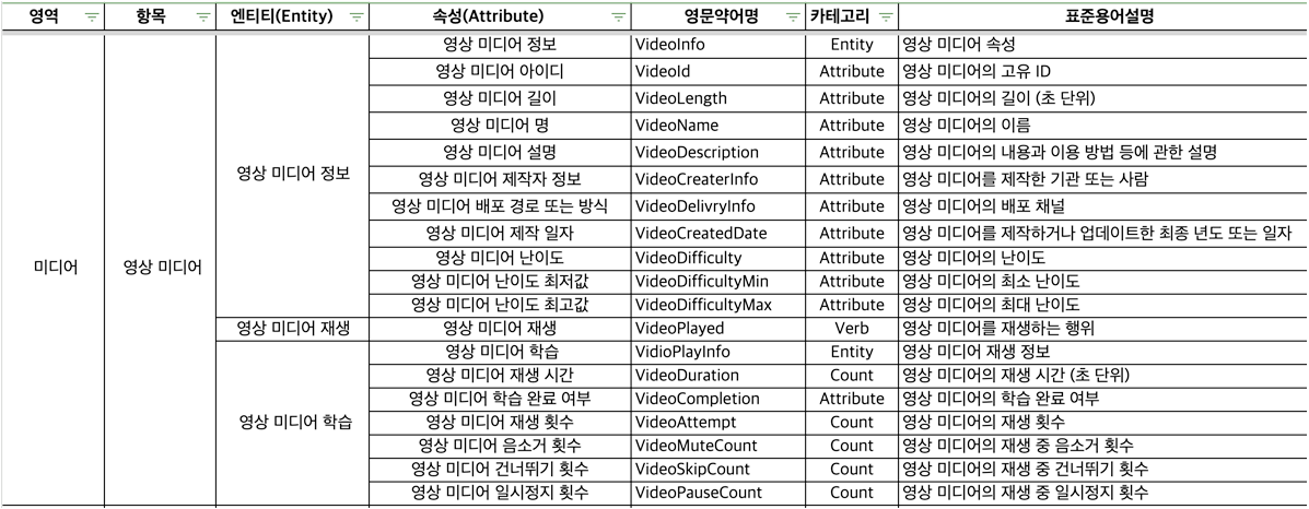 (아래 예시에서 사용자 ID는 생략되었음) VideoInfo(entity: 영상 미디어 정보) VideoAttempt(count: 영상 미디어 재생 횟수) VideoMuteCount(count: 영상 미디어 음소거 횟수) VideoSkipCount(count: 영상 미디어 건너뛰기 횟수) VideoPauseCount(count: 영상 미디어 일시멈춤 횟수) |
